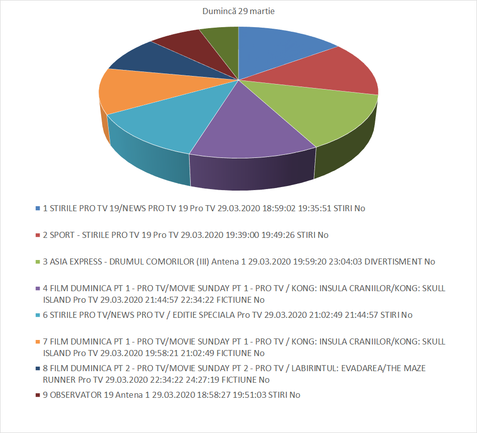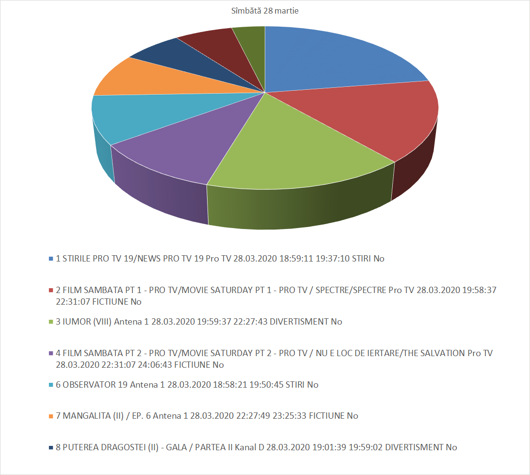 Principalul buletin informativ al Pro Tv a obținut un share de 36,6% și un rating de 13,9%, în ediția de sâmbătă, 28 martie și un share de 38,8% și 12,2% rating, în ediția de dumincă, 29 martie. În comparație, Observator 19, principala emisiune de știri a concurenților de la Antena3 a realizat 15,4% share și un rating de 5,9%, sâmbătă 28 martie, respectiv 15,9%share și 6% rating în ediția de duminică, 29 martie.