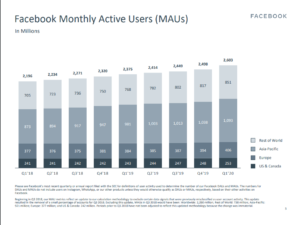 Numărul persoanelor care au folosit Facebook lunar a crescut, în primul trimestru din 2020, cu 10% ajungând la 2,6 miliarde de la 2,37 de miliarde în primul trimestru al anului 2019. Numărul persoanelor care au folosit Facebook zilnic în aceeași perioadă a crescut cu 77 de milioane, cea mai mare creștere din 2011.