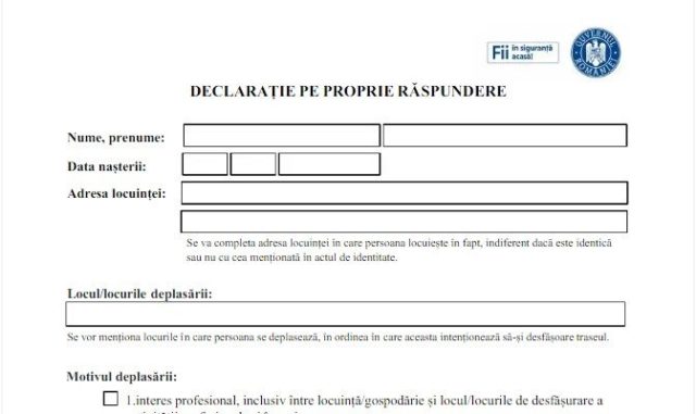 În perioada stării de alertă deplasarea în afara localității este interzisă, cu excepția unor situații definite clar de autorități, care necesită completarea unei declarații pe propria răspundere.