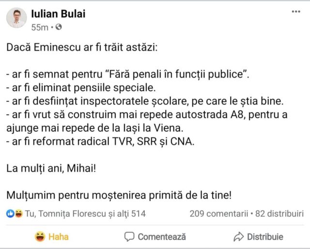 “Eminovici putea prinde anii 30, ar fi avut optzeci și ceva de ani, tare i-ar mai fi plăcut, ce ar mai fi slăvit poetul nepereche Romînia dodoloață, adevărații ani romantici. dacă ajung prin oraș mîine o să mă piș pe statuia dînsului, oricum avem la fiecare colț în Iași, măcar pt instigări ca “de la Nistru pîn la Tisa”
