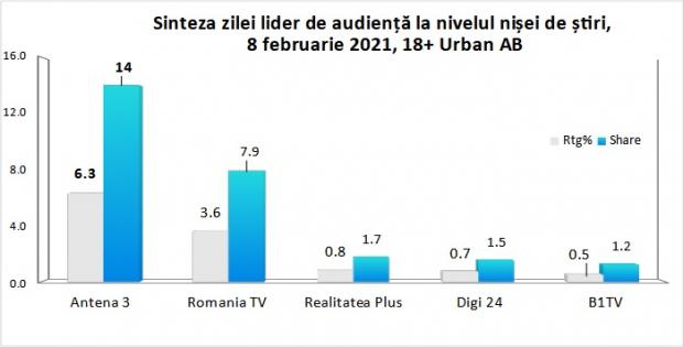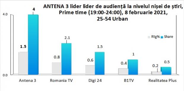 Antena 3 a fost lider întreaga zi. Datele de audienţă arată că în cazul publicului urban de peste 18 ani, cota de piaţă înregistrată de Antena 3 a fost de 3,2%, cu aproape un procent mai mult faţă de televiziunile concurente.