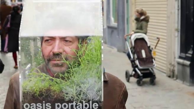În vârstă de șaizeci și unu de ani, Alain Verschueren nu este doar artist, ci și asistent social și de câteva zile, de când și-a finalizat lucrarea de căpătâi, se plimbă mândru cu ea pe cap pe străzile din Bruxelles. Cutia sa, numită „oază portabilă”, se vrea a fi pentru măști ceea ce a fost YouTube-ul pentru MP3 Player și Facebook pentru Hi5. Mini-sera cu pereți din plexiglas (pepsiglas?) asigură purtătorului „aer purtificat de plantele din interior”.
